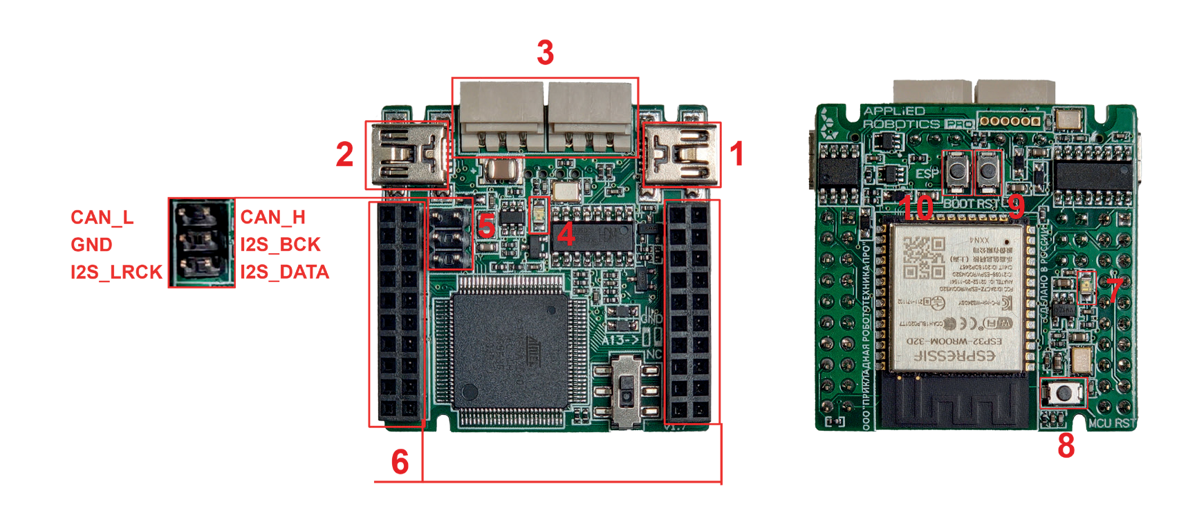 - Штыревой разъем, содержащий интерфейсы I2S и CAN.