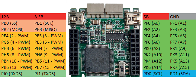 - miniUSB порт для подключения к ПК и программирования основного контроллера – Atmega2560. Данный порт может использоваться для подачи на модуль питания 5В.