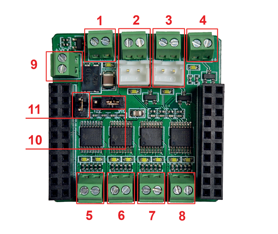 - Клеммник для подключения внешнего питания. В зависимости от типа двигателя постоянного тока, может разниться напряжение питания, необходимое для его корректной работы.