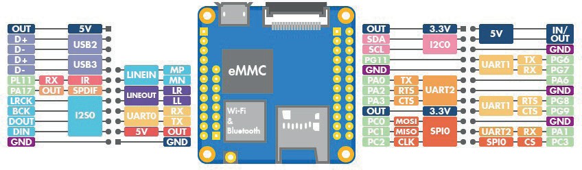 Интерфейс I2S для подключения цифровой аудио периферии. Интерфейс I2C для подключения различной сетевой периферии. Аналоговые аудио вход и выход для подключения микрофона и динамиков.