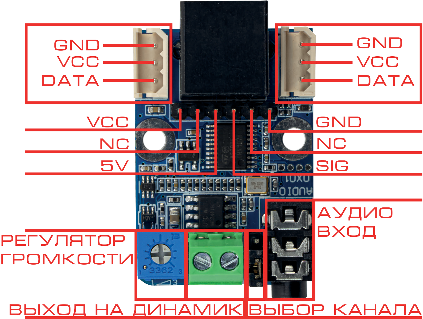 - SIG – сигнальная линия, на которую необходимо подать сигнал с MP3 плеера для последующего усиления;