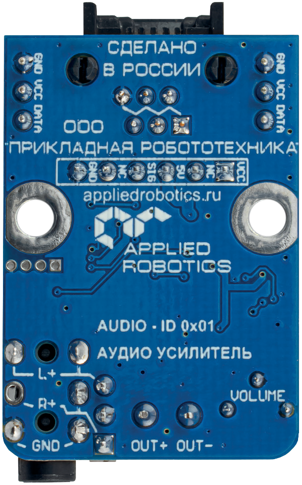 Модуль «Аудиоусилитель» представляет собой устройство, предназначенное для усиления аудиосигнала, получаемого от MP3-плеера, и позволяющее воспроизводить этот сигнал с помощью динамика. Внешний вид модуля показан на Рис. 1.2 и Рис. 1.3.