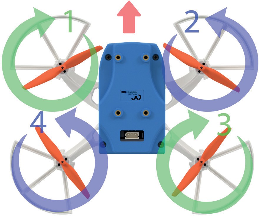 Пропеллеры вращаются как по часовой стрелке, так и против неё. Обычно на квадрокоптере используется комбинация из обоих направлений вращения. Это необходимо для того, чтобы уравновесить крутящий момент, возникающий из-за вращения каждого из пропеллеров, что позволяет оставаться стабильным в воздухе и обеспечивает управление полетом.