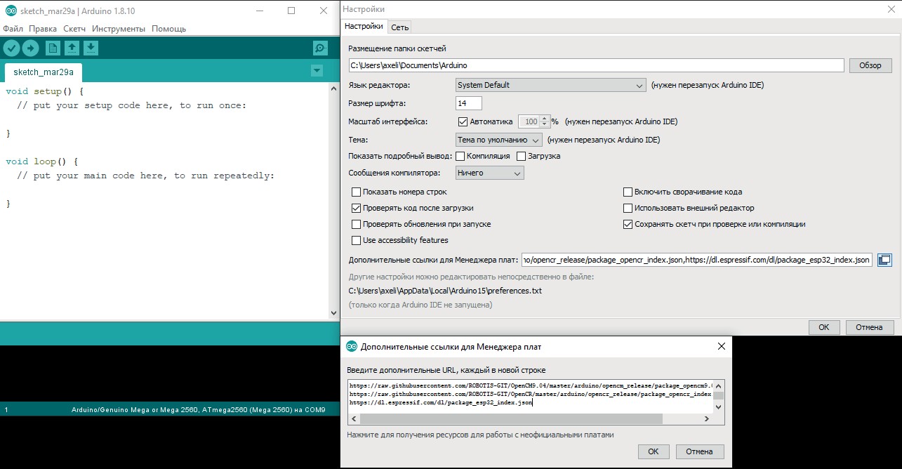 Универсальный вычислительный контроллер DXL-IoT является подобной Arduino Mega 2560 платой. Среда программирования Arduino IDE, позволяет реализовать возможность разработки программного кода, для платы DXL-IoT, применяя на практике те же подходы и библиотеки, что и для Arduino Mega 2560. Для работы с контроллером рекомендуется использовать среду разработки Arduino IDE версии не ниже 1.8, которую необходимо скачать с сайта Arduino.cc и инсталлировать в операционную систему штатными средствами. Поскольку на контроллере имеется модуль беспроводной связи Wi-Fi / Bluetooth, необходимо добавить в среду разработки поддержку данного модуля. Для этого нужно перейти в меню «Файл» - «Настройки» - «Дополнительные ссылки для Менеджера плат» и в открывшемся окне (Рис. 2.1) вставить следующую ссылку: https://dl.espressif.com/dl/package_esp32_index.json