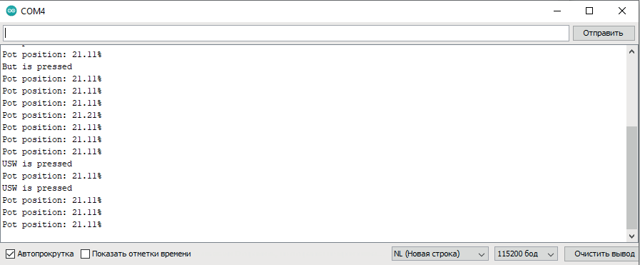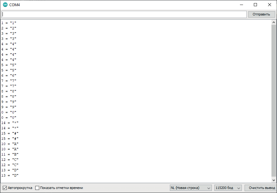**Рисунок 3.2. **Результат опроса подключенных модулей ввода данных в среде Arduino IDE
