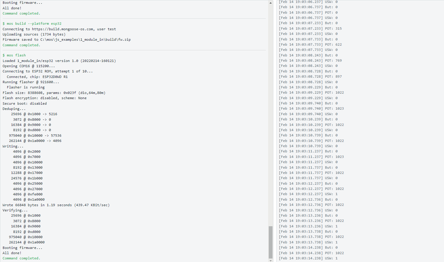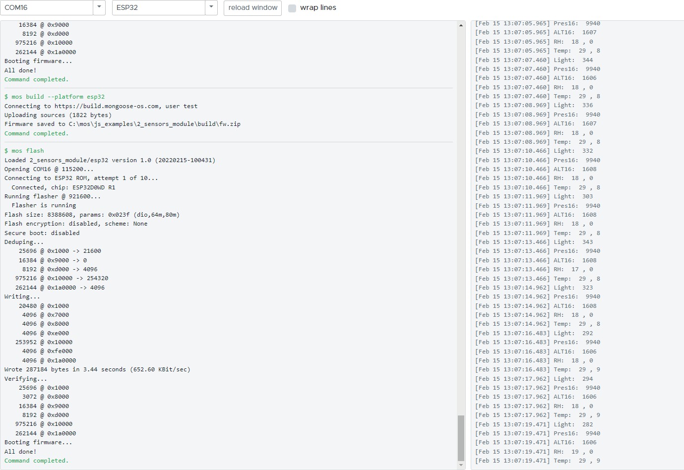 В случае использования среды разработки **Mongoose OS **при использовании JavaScript, код, реализующий аналогичный пример, будет выглядеть следующим образом: