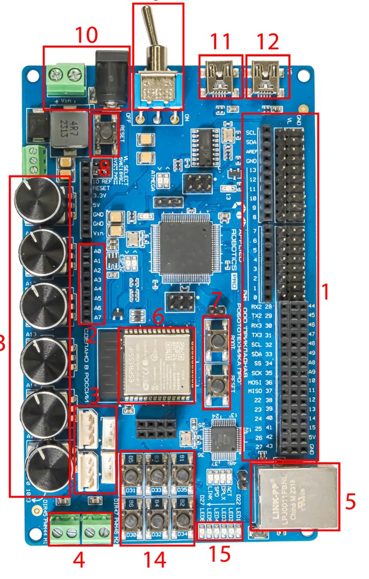 Также микроконтроллер позволяет воспользоваться уже встроенным в плату светодиодом. Всего на плате семь светодиодов, в том числе шесть программируемых пользовательских и один сервисный светодиод. В коде идёт обращение к первому, он подключен к 22 пину.