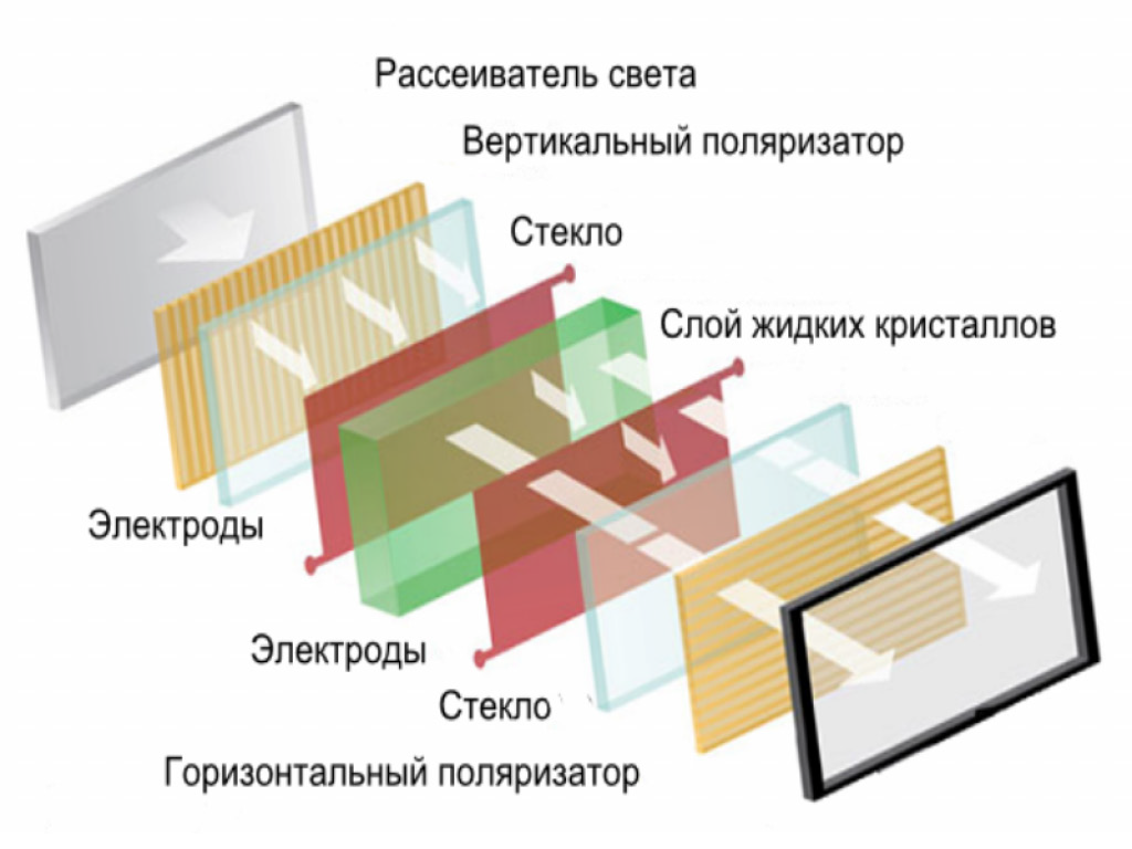 Практически все существующие сегодня LCD дисплеи имеют идентичное устройство. Если говорить о конструкции, то любой LCD монитор или телевизор состоит из следующих компонентов (Рисунок 14.1):