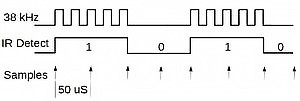 Работа пульта дистанционного управления осуществляется следующим образом (Рисунок 19.1). При нажатии кнопки на пульте происходит кодирование сигнала в инфракрасном свете. Приемник сигнала на управляемом устройстве принимает сигнал и выполняет требуемое действие. Информация кодируется в виде логической последовательности пакетов импульсов с определенной частотой. Приемник получает эту последовательность и выполняет демодулирование данных. Для приема сигнала используется микросхема, в которой содержатся фотоприемник (фото- диод), усилители, полосовой фильтр, демодулятор (детектор, который позволяет выделить огибающую сигнала) и выходной транзистор. Также в ней установлены электрический и оптический фильтры. Работают такие устройства на расстоянии до 40 метров. Инфракрасный способ передачи данных используется во многих устройствах: в бытовых приборах, в промышленной технике, компьютерах, оптоволоконных линиях.