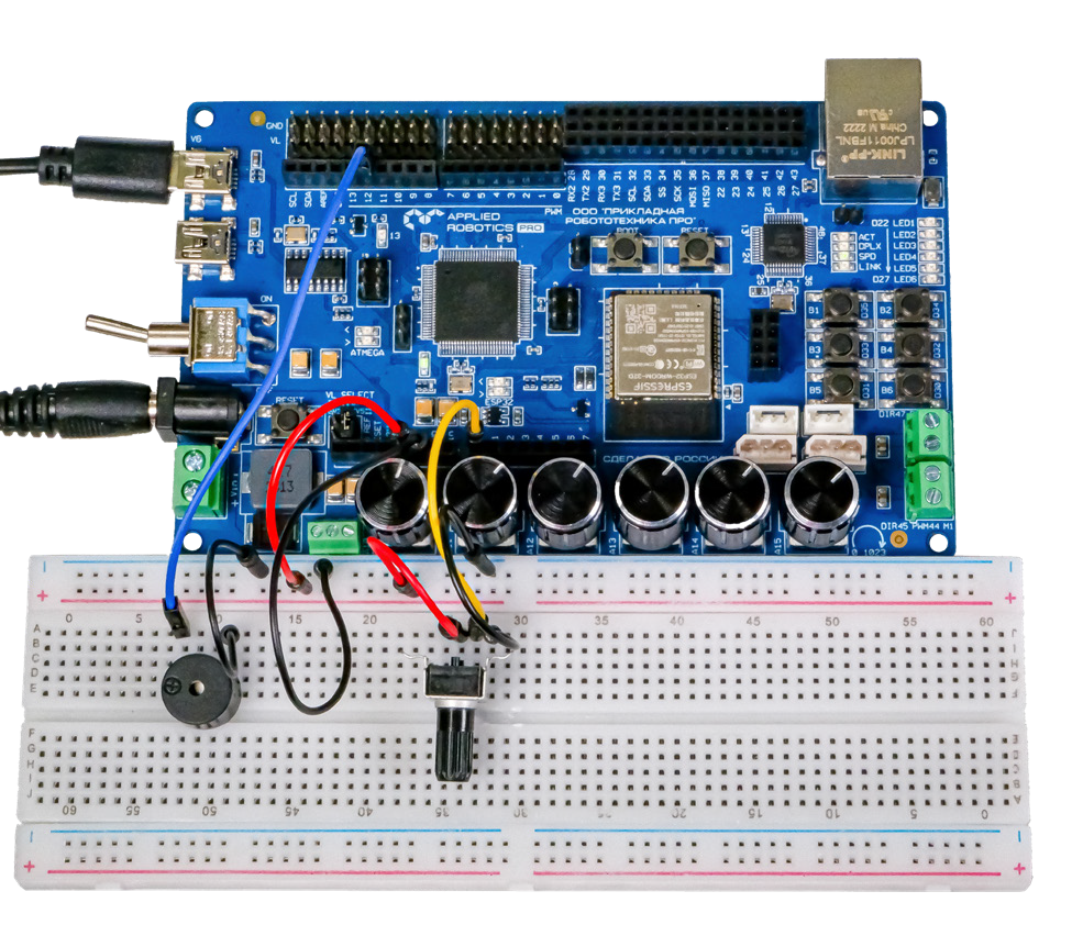 При выполнении данной лабораторной работы используется следующая схема подключения (Рисунок 4.2). Для реализации проекта потребуются следующие компоненты: макетная плата, потенциометр (1 шт), пьезодинамик (1 шт) и провода.