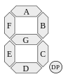 Сегменты обозначаются буквами от A до G; восьмой сегмент — десятичная точка, предназначенная для отображения дробных чисел, называется decimal point (DP) (Рисунок 10.3).