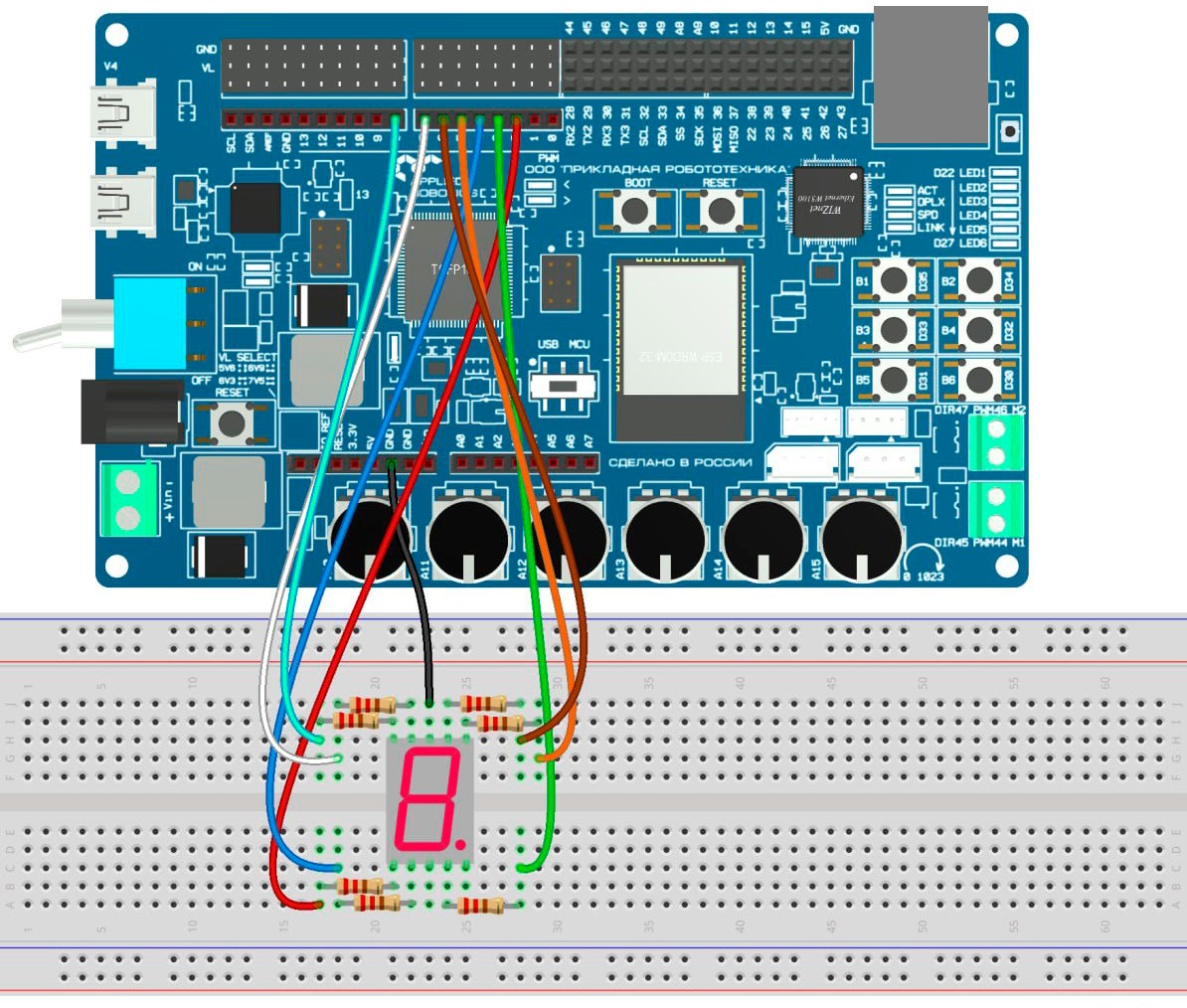 К данной рабочей программе используется следующая схема под- ключения (Рисунок 10.4). Для реализации проекта потребуются следую- щие компоненты: макетная плата, резистор на 220 Ом (7 шт), семисег- ментный индикатор (1 шт) и провода.
