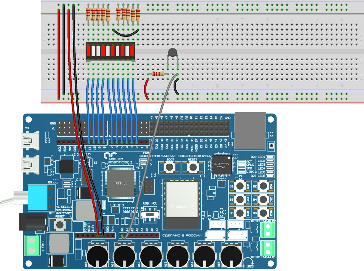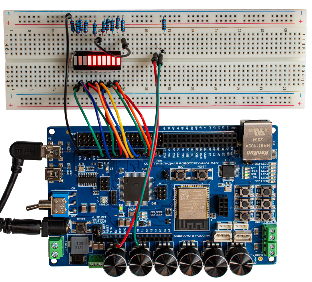 - Подключить потенциометр и изменить программу так, чтобы им можно было регулировать начальное значение для включения первого светодиода.