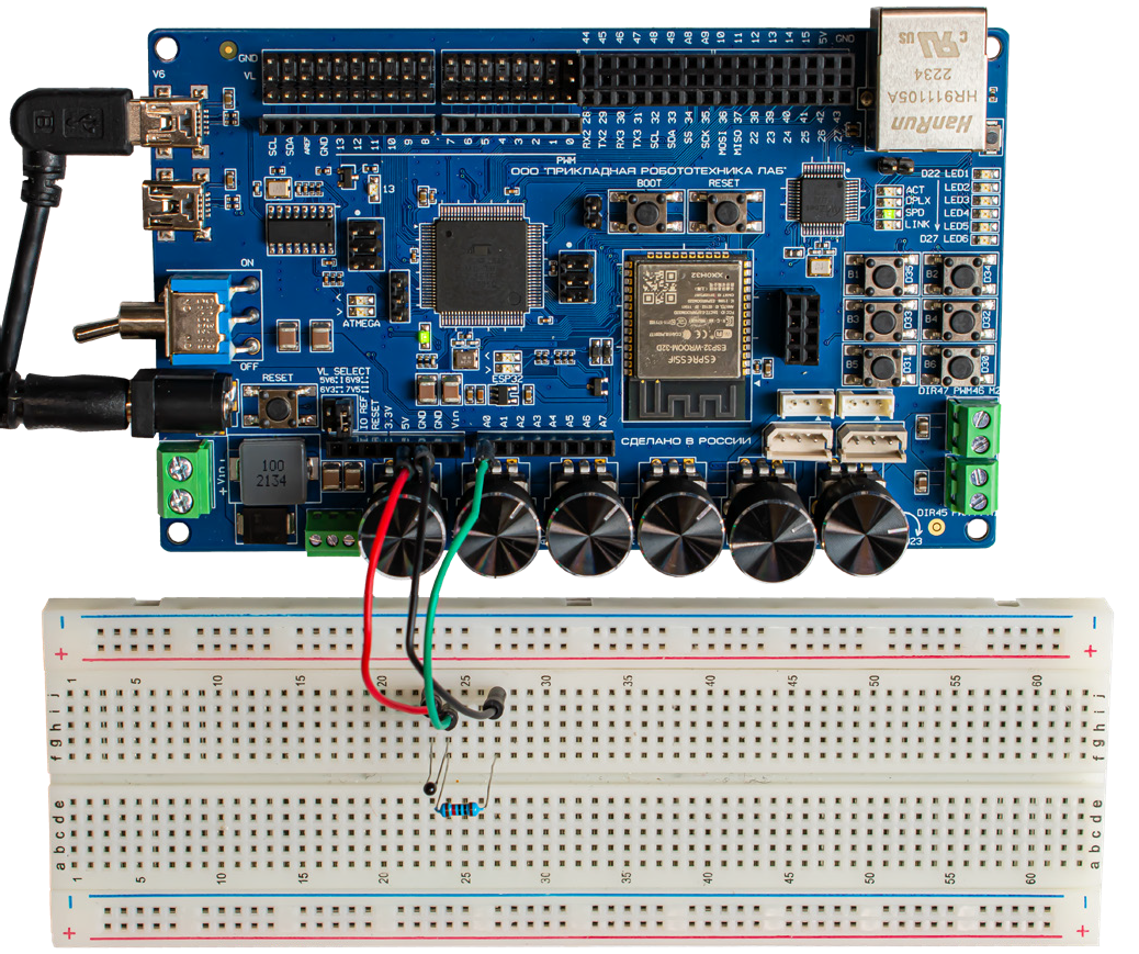 }Вместо светодиодной ленты используются встроенные в плату светодиоды (пин 22 - 28). При установке температуры в 20 градусов будут гореть все светодиоды. Если нагреть датчик, то постепенно светодиоды перестанут гореть по очереди. А если наоборот, перестать нагревать, светодиоды по очереди будут загораться.