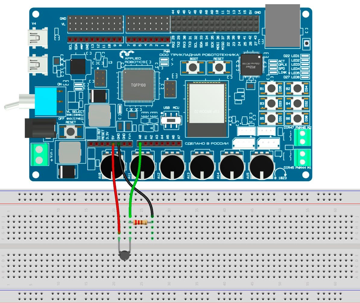 К данной рабочей программе используется следующая схема подключения (Рисунок 11.5). Для реализации проекта потребуются следующие компоненты: макетная плата, резистор на 10 кОм (1 шт), термистор (1 шт) и провода.