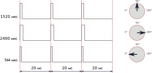 Чтобы указать сервоприводу желаемое положение, по предназначенному для этого проводу необходимо послать управляющий сигнал (Рисунок 15.2). Управляющий сигнал — импульсы постоянной частоты и переменной ширины. Положение, которое должен занять сервопривод, зависит от длины импульсов. Чаще всего импульсы производятся с частотой 50 Гц. Это значит, что импульс испускается и принимается раз в 20 мс.