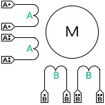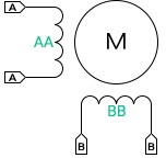 - Биполярный двигатель (Рисунок 16.4) имеет 4 вывода. Выводы A и A питают обмотку AA, выводы B и B питают обмотку BB. Для включения электромагнита, на выводы обмотки необходимо подать разность потен- циалов (два разных уровня), поэтому двигатель называется биполярным. Направление магнитного поля зависит от полярности потенциалов на выводах.