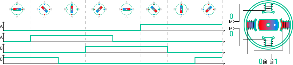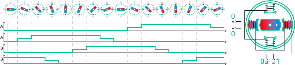 Управление шаговым двигателем может быть реализовано по одному из четырех основных алгоритмов, которые зависят от типа соединения электромагнитов: попеременное включение фаз, управление с перекрытием фаз, полушаговое управление или микрошаговое управление (Рисунок 16.8 а-г).