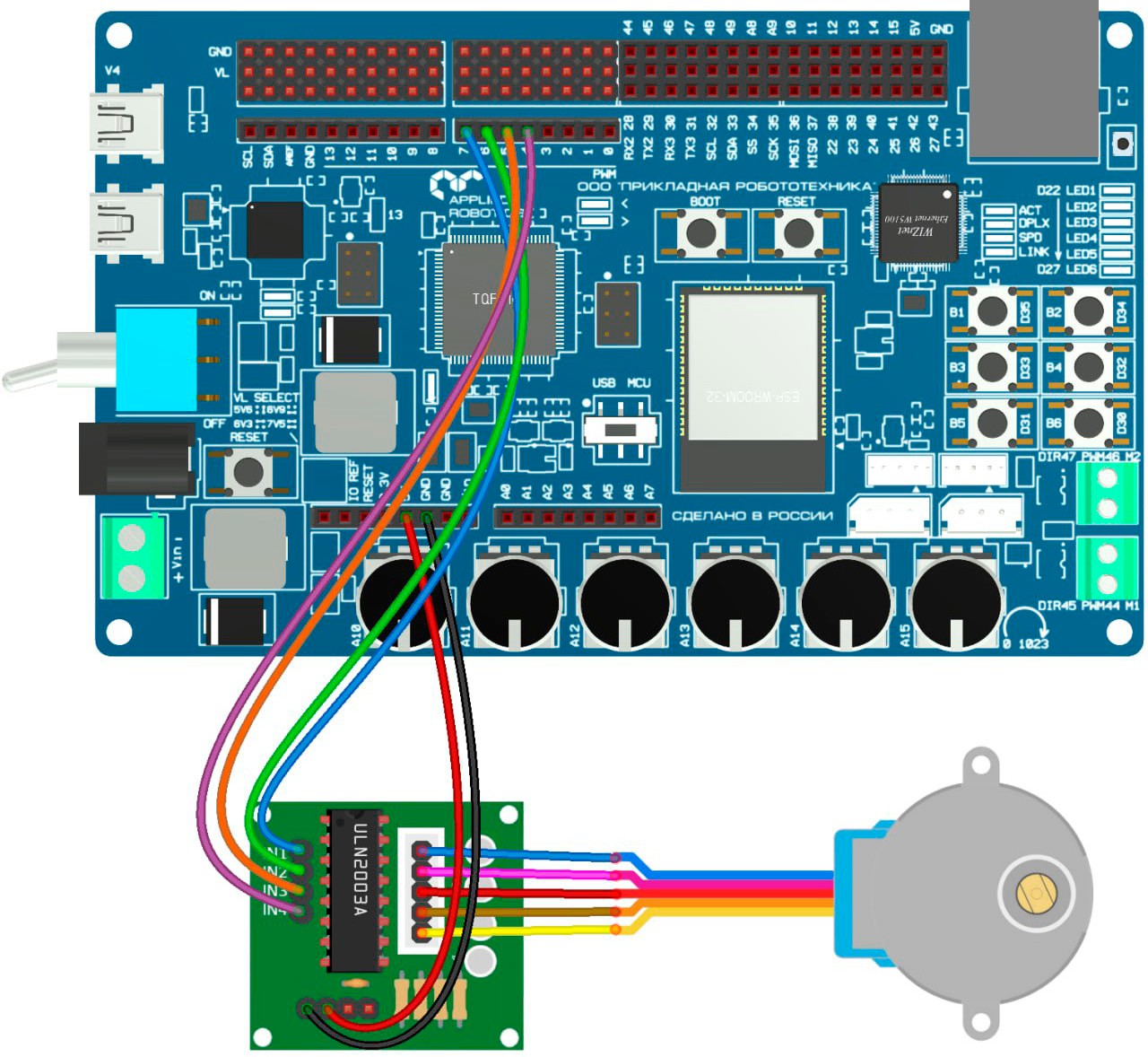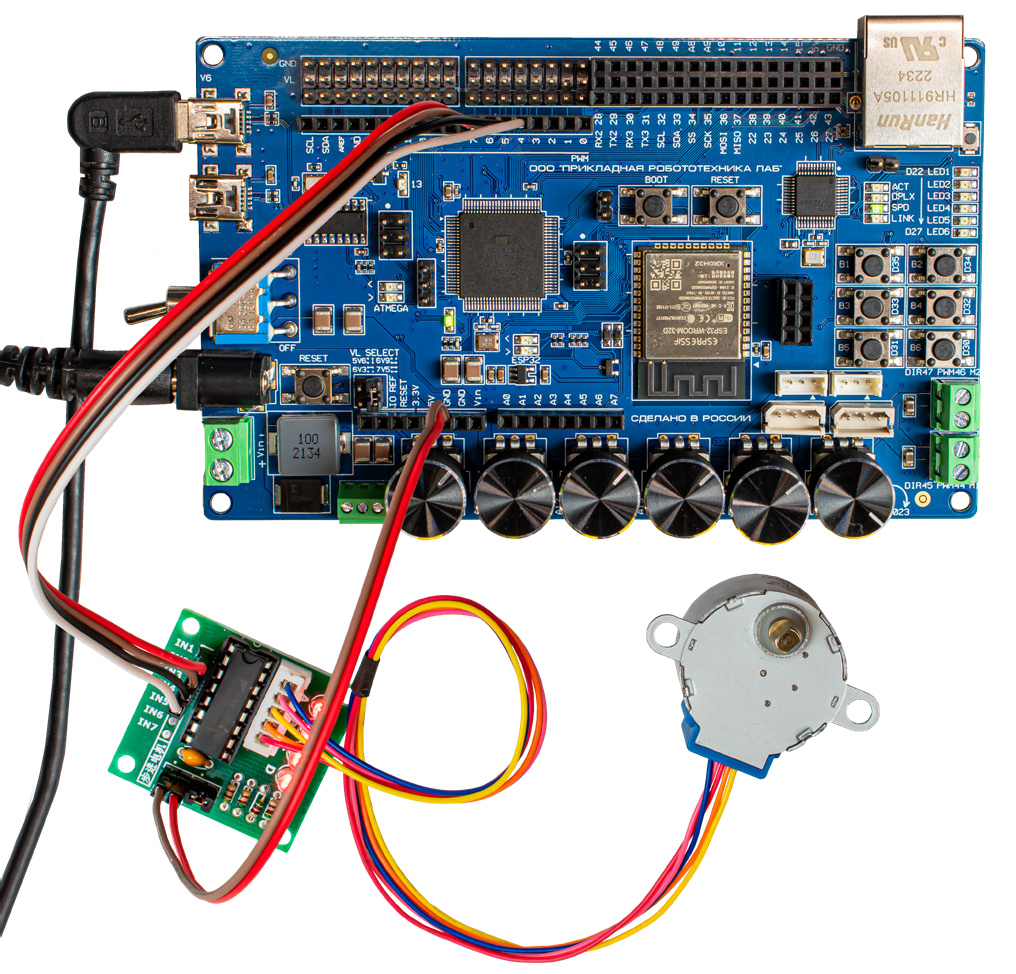 Используем драйвер наиболее распространенной модели SBT0811. Для его вращения нужно подсоединить 4 провода к цифровым выходам платы (IN1, IN2, IN3, IN4). Для вращения по часовой стрелке сигнал дол- жен подаваться в следующей последовательности: