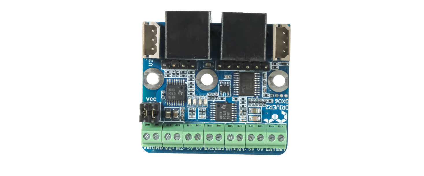 Модуль «Драйвер двигателя постоянного тока (2 канала)» по сути, представляет собой сдвоенный модуль «Драйвер двигателя постоянного тока», способный реализовать систему управления одновременно двумя двигателями постоянного тока. Данный модуль (Рисунок 17.1), аналогично одноканальному, способен реализовывать систему управления, на основании данных от встроенных энкодеров, а так же позволяет выбирать источник питания двигателей.