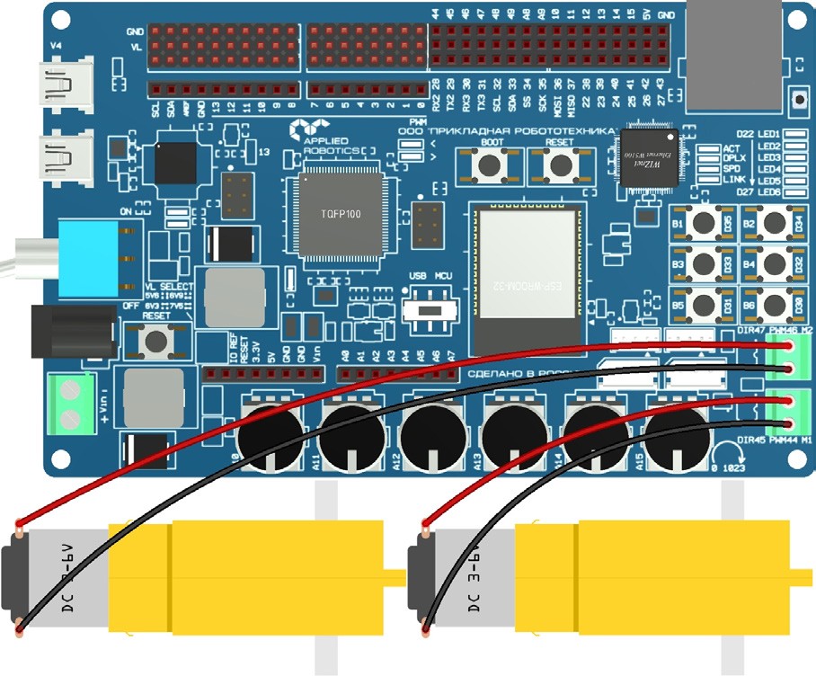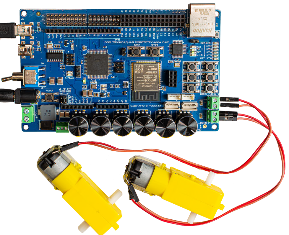 Контроллер КПМИС имеет два встроенных драйвера для двигателей, поэтому нам не требуется дополнительная плата расширения. Для работы моторов на полную мощность необходимо подключить внешнее питание к плате.