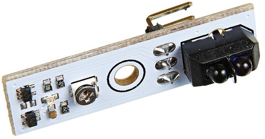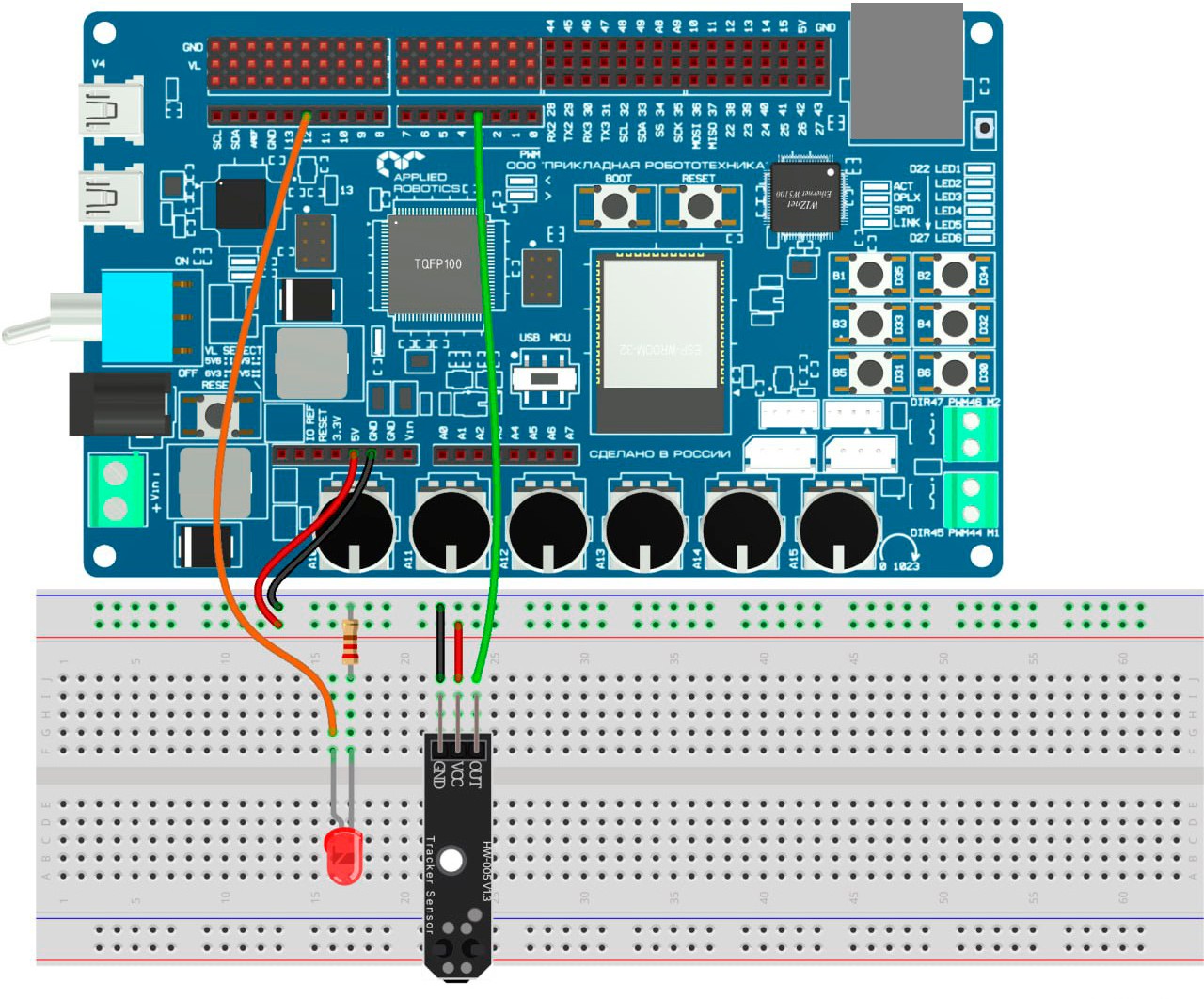 Датчик линии (Рисунок 18.1) позволяет определять цвет поверхности около датчика. Выходным сигналом датчика является простой бинарный цифровой сигнал: логические «0» или «1», в зависимости от цвета, который он видит перед собой. Логическая единица обозначает чёрный цвет (или пустоту), а логический ноль — не чёрный.