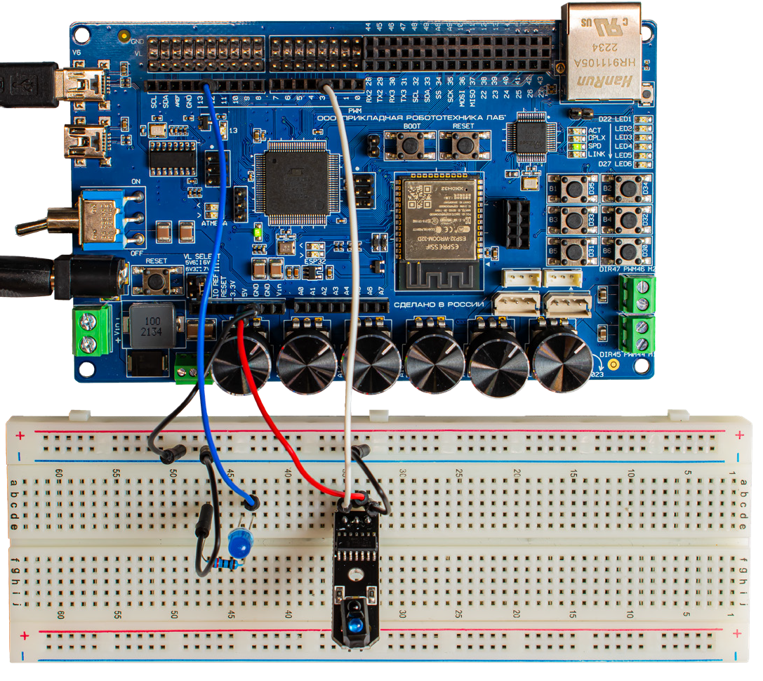 В данной лабораторной работе необходимо разработать программу, которая будет зажигать или гасить светодиод, в зависимости от наличия препятствия перед ИК датчиком.