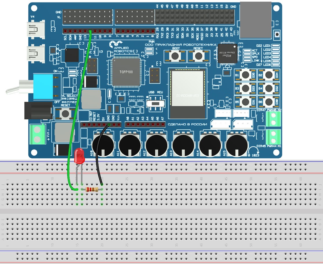 При выполнении данной лабораторной работы используется следующая схема подключения (Рисунок 2.7). Для реализации проекта потребуются следующие компоненты: макетная плата, светодиод (1 шт), резистор на 220 Ом (1 шт), провода.