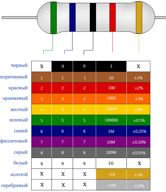 Резистор является одним из самых часто применяемых в электронике элементов, который служит для ограничения тока в цепи. Резисторы условно классифицируют по номинальному значению сопротивления току. Номинал резистора можно определить по цветным полоскам (Рисунок 2.1).