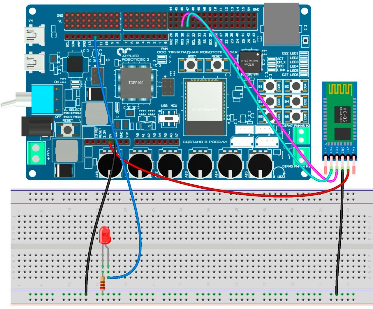 К данной рабочей программе используется следующая схема подключения (Рисунок 20.2). Для реализации проекта потребуются следующие компоненты: макетная плата (1 шт), светодиод (1 шт), резистор на 220 Ом (1 шт), Bluetooth-модуль (1 шт) и провода.