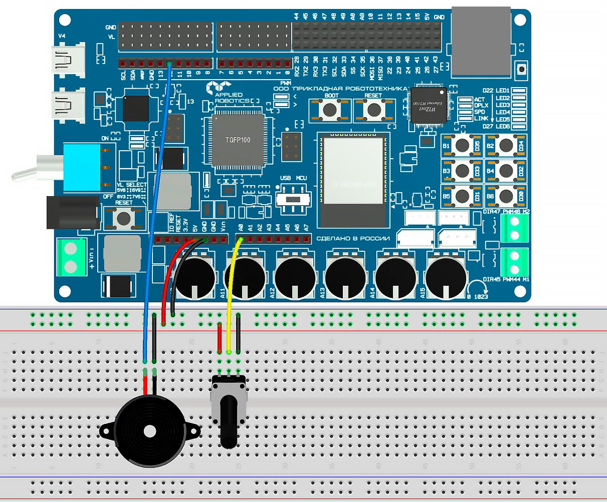 При выполнении данной лабораторной работы используется следующая схема подключения (Рисунок 4.2). Для реализации проекта потребуются следующие компоненты: макетная плата, потенциометр (1 шт), пьезодинамик (1 шт) и провода.
