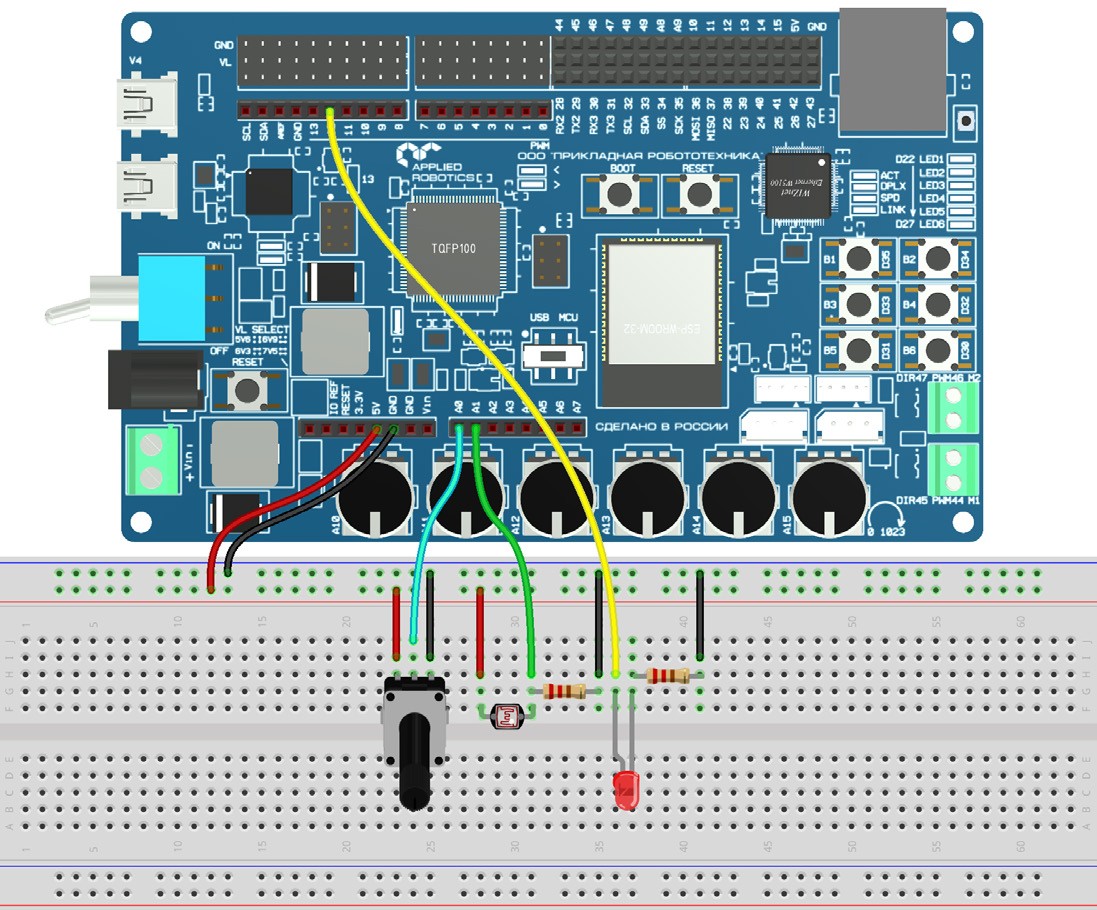 К данной рабочей программе используется следующая схема под- ключения (Рисунок 5.2). Для реализации проекта потребуются следую- щие компоненты: макетная плата, светодиод (1 шт), фоторезистор (1 шт), потенциометр (1 шт), резистор на 220 Ом (1 шт), резистор на 10 кОм (1 шт) и провода.