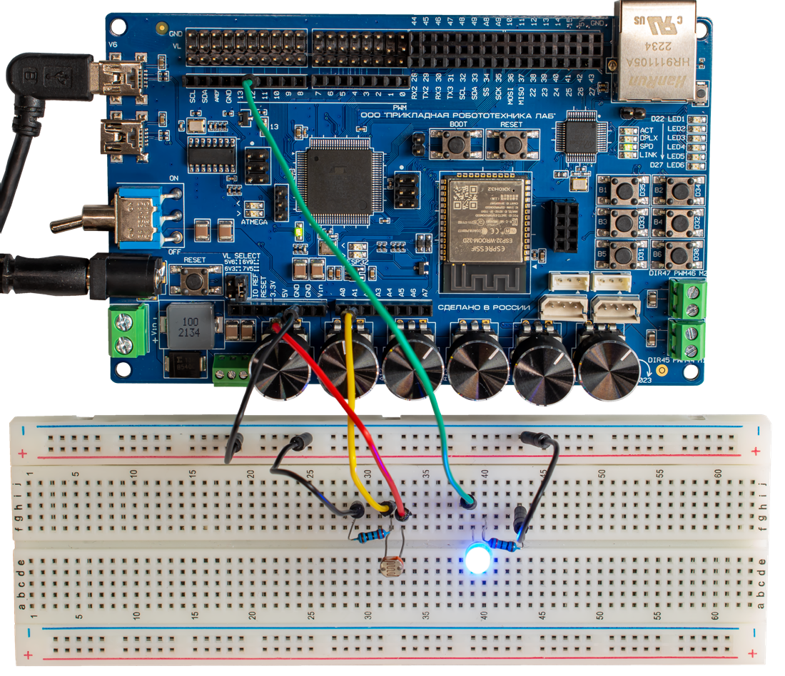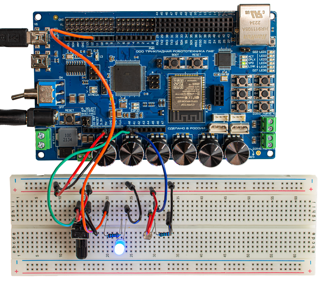 - Изменить программу так, чтобы яркость свечения светодиода в зависи- мости от света в комнате или поворота ручки потенциометра.