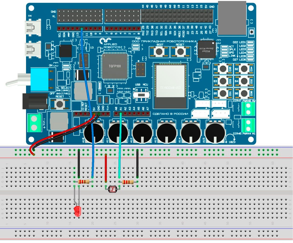 К данной рабочей программе используется следующая схема подключения (Рисунок 5.4). Для реализации проекта потребуются следующие компоненты: ма- кетная плата, светодиод (1 шт), фоторезистор (1 шт), резистор на 220 Ом (1 шт), резистор на 10 кОм (1 шт) и провода.