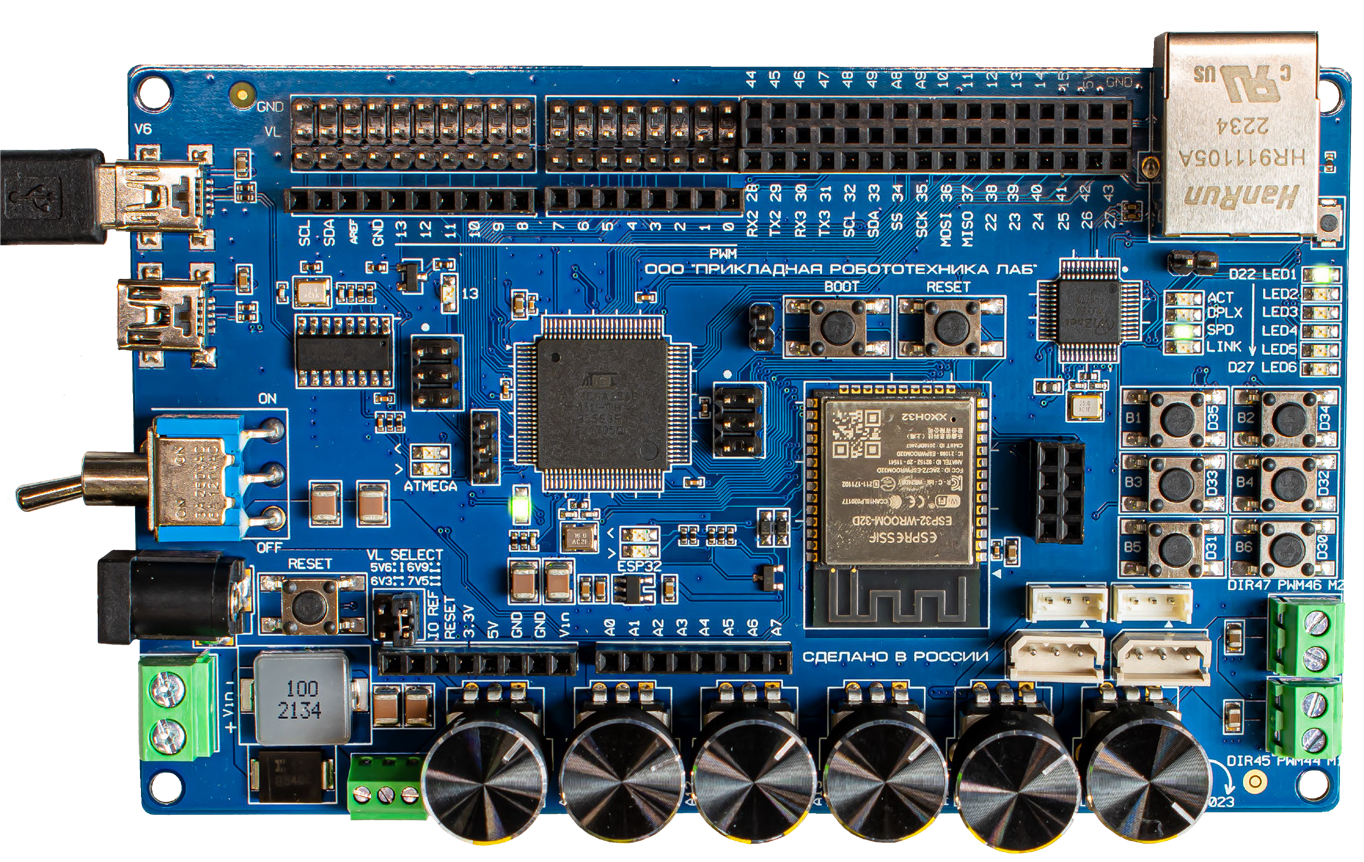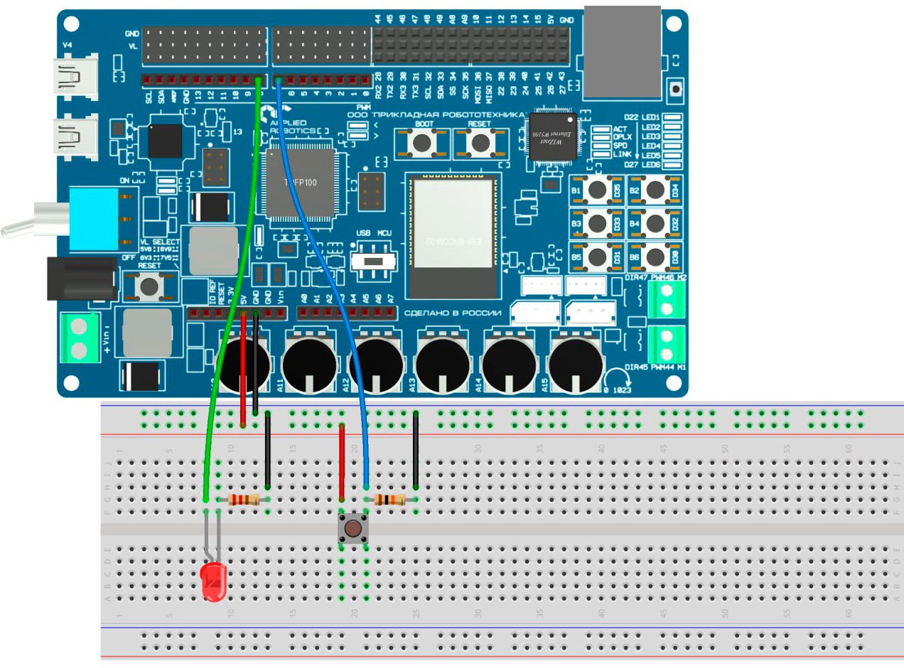 Помимо этого, контроллер КПМИС позволяет воспользоваться уже встроенными в плату кнопками и светодиодами. Всего на плате имеется шесть кнопок и шесть светодиодов. В коде программы следующего при- мера идёт обращение к первой встроенной кнопке, подключенной к 35 пину и к светодиоду, подключенному к 22 пину (Рисунок 7.5).