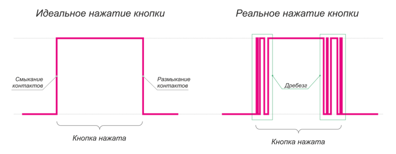 Дребезг - явление, происходящее в электромеханических коммутационных устройствах, длящееся некоторое время после замыкания электрических контактов и состоящее из многократного неконтролируемого замыкания и размыкания контактов. Явление обусловлено упругостью материалов и деталей контактной системы - контакты «подпрыгивают» некоторое время при соударениях, размыкая и замыкая электрическую цепь. Таким образом, дребезг - явление между двумя стабильными со- стояниями контактов (Рисунок 9.1).