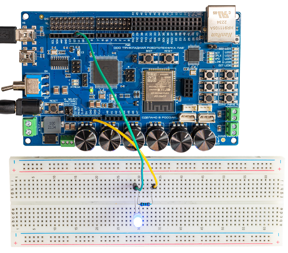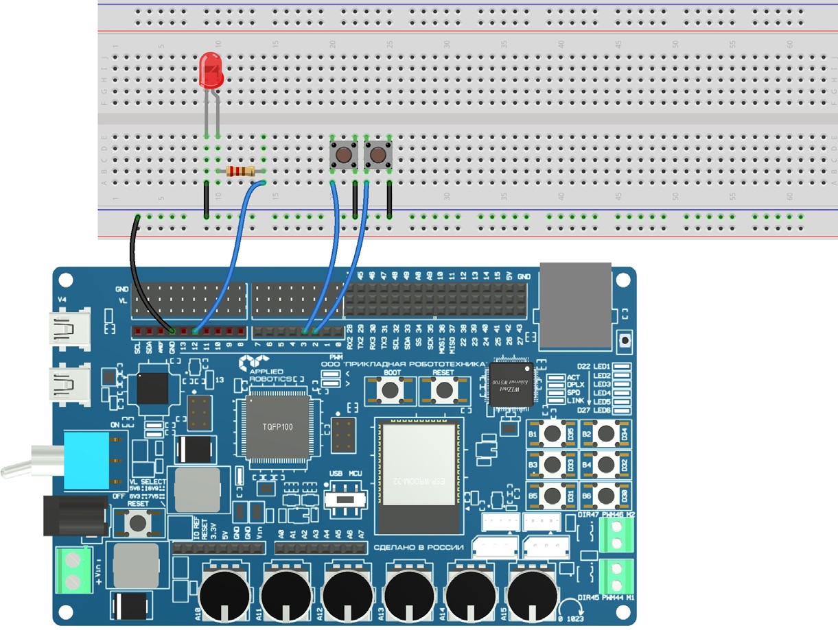 }Контроллер КПМИС позволяет воспользоваться уже встроенными в плату кнопками. Всего на плате имеется шесть кнопок. Далее, в программе идёт обращение к первой встроенной кнопке, подключенной к 35 пину.