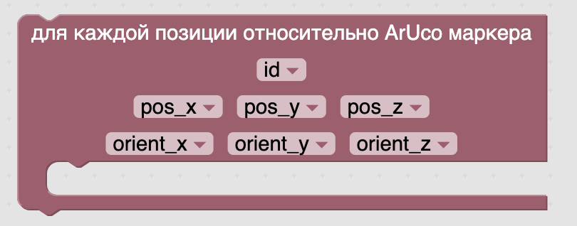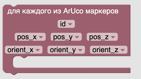 - Для каждого из ArUco маркеров – получение текущих детектируемых маркеров в виде массива и проход в цикле по ним (позиция и ориентация маркеров относительно камеры).
