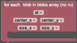 - Для каждого блоба в массиве блобов – получение цветового блоба из детектируемых в данный момент цветовых блобов. Позволяет получить его id, координаты центра и размер.