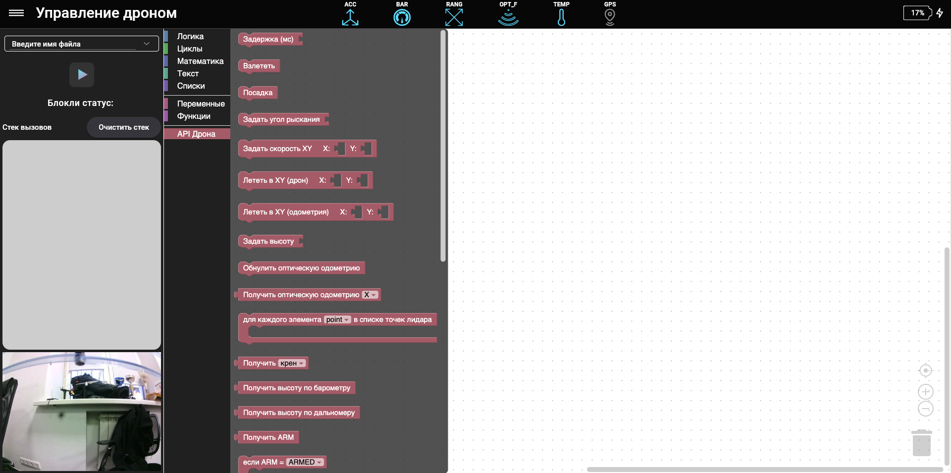 В доступных блоках есть вкладка “API Дрона”, позволяющая реализовывать автономный полет дрона с помощью блочного программирования.