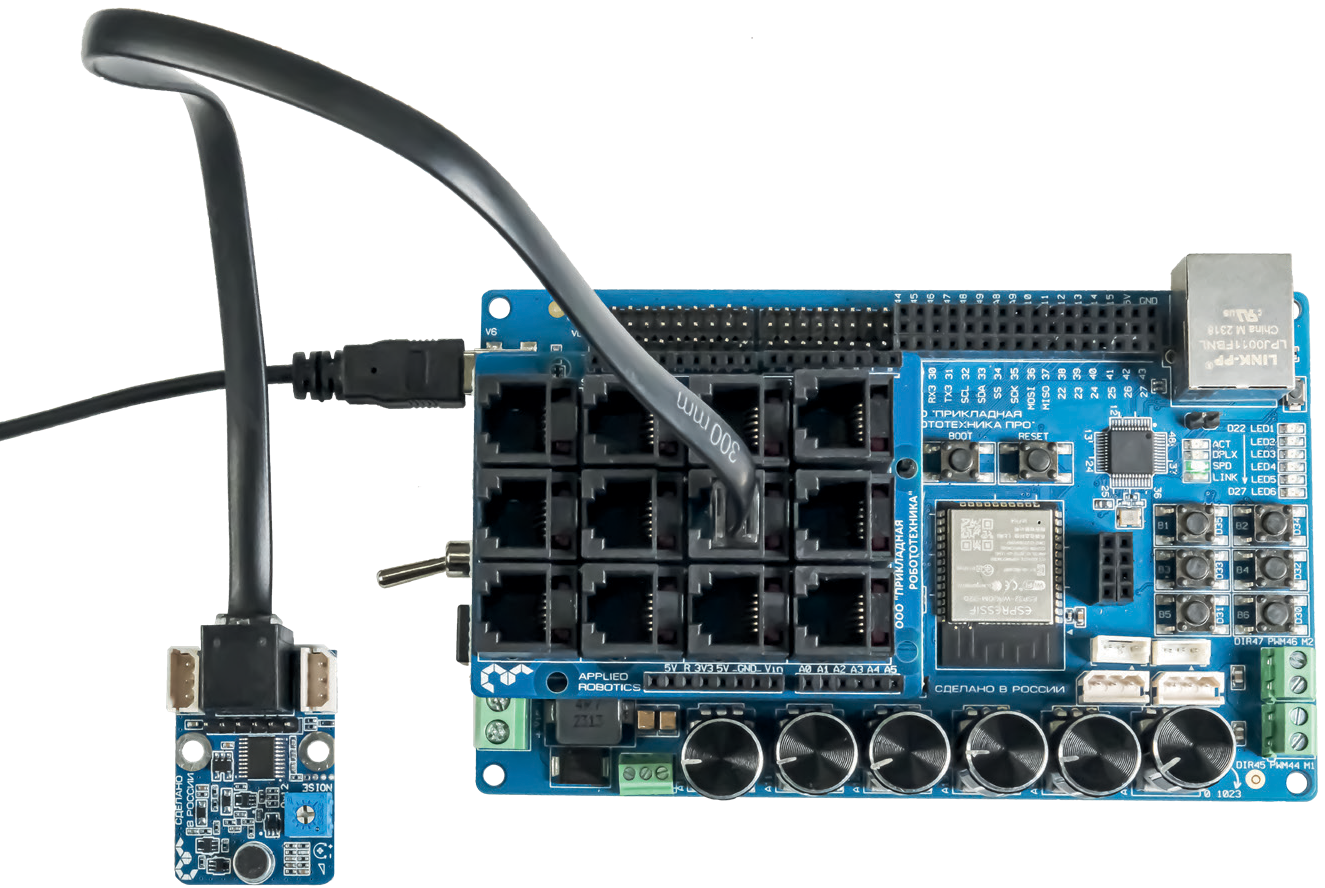 Другим глобальным подходом к работе с модулями является использование их в качестве Dynamixel-совместимых устройств. На каждом из модулей находится микроконтроллер, который реализует Dynamixel-интерфейс, тем самым, позволяя подключать различные модули последовательно друг за другом в цепь. Такой способ подключения имеет преимущество, если необходимо подключить одновременно много модулей к контроллеру и максимально снизить количество используемых в коде библиотек. Для работы с несколькими разнотипными модулями одновременно достаточно только одной библиотеки.