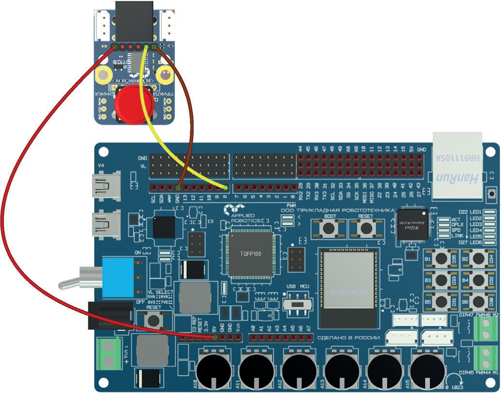 Подключаем модуль «Тактовая кнопка» к контроллеру КПМИС в соответствии со схемой расположения контактов. Линию модуля 5В подключаем к линии 5В контроллера, линию GND – к GND контроллера, а SIG – к цифровой линии. В результате, подключённый к модуль будет выглядеть следующим образом (см. Рис. 2.1 и Рис. 2.2).