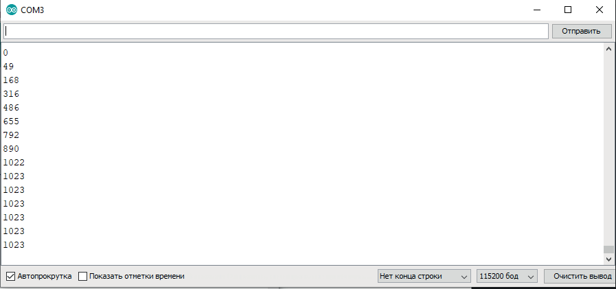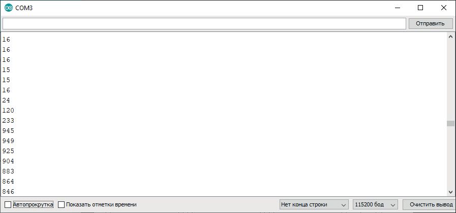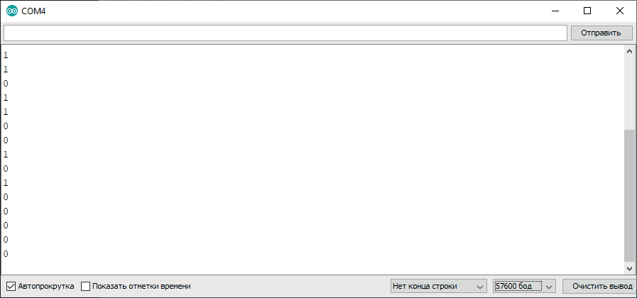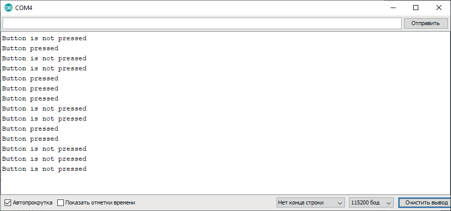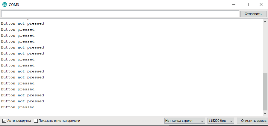 }И загрузим его в контроллер стандартным способом. В результате, если открыть монитор порта на скорости 115200 и понажимать на кнопку, можно увидеть, как меняется состояние системы (Рис. 2.3):