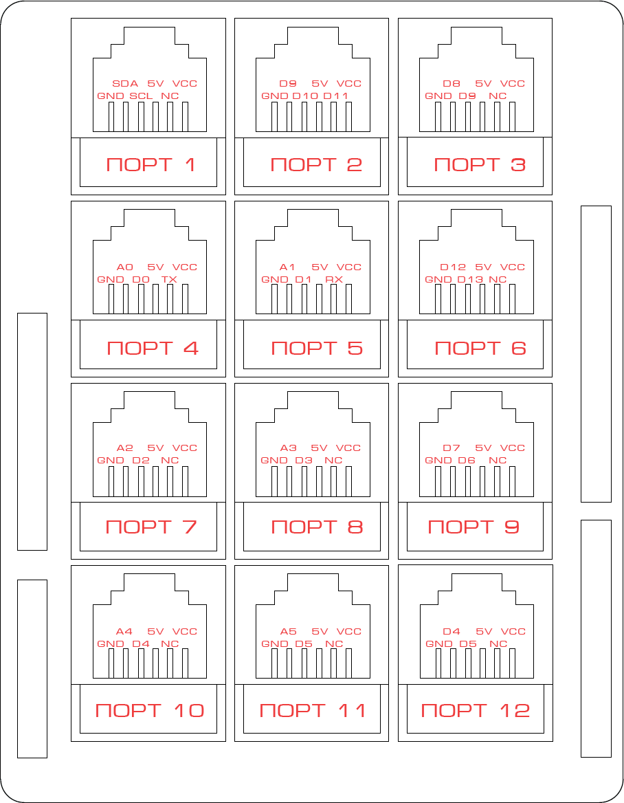 Рассматриваемые модули обладают двумя глобальными подходами к их применению. Первый подход они могут выступать как классические Arduino-датчики, подключение к которым выполняется с помощью стандартных проводов типа «мама-мама» или «папа-мама». Для такого способа подключения все модули имеют в своем составе шестипиновую гребенку с контактными линиями и на оборотной стороне каждого модуля есть расшифровка каждого пина. Для облегчения подключения модулей к Arduino может быть использована плата расширения для подключения сенсорных модулей AR-SENS-RJ14. Подключение модулей выполняется через встроенные разъемы RJ14 платы расширения.