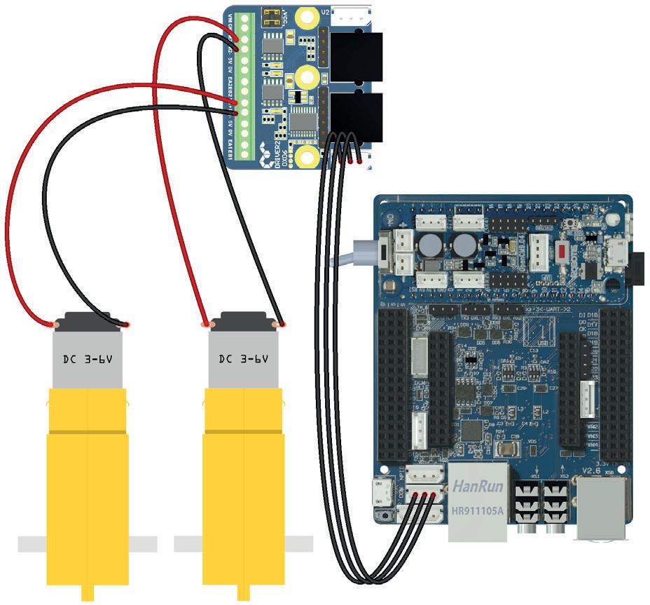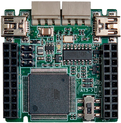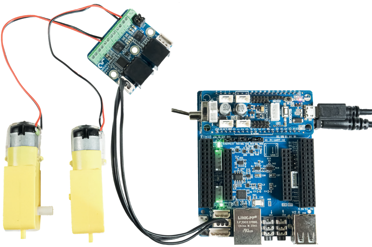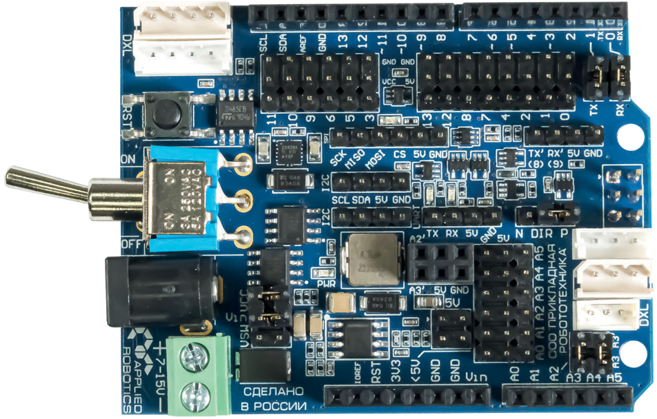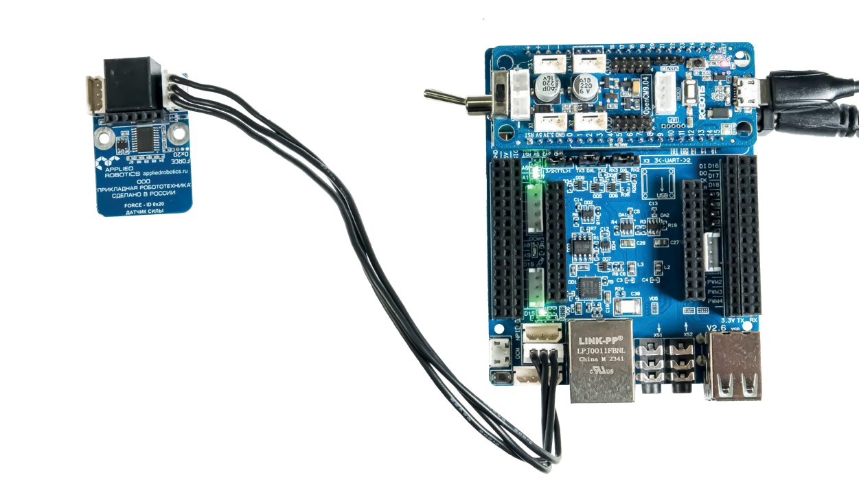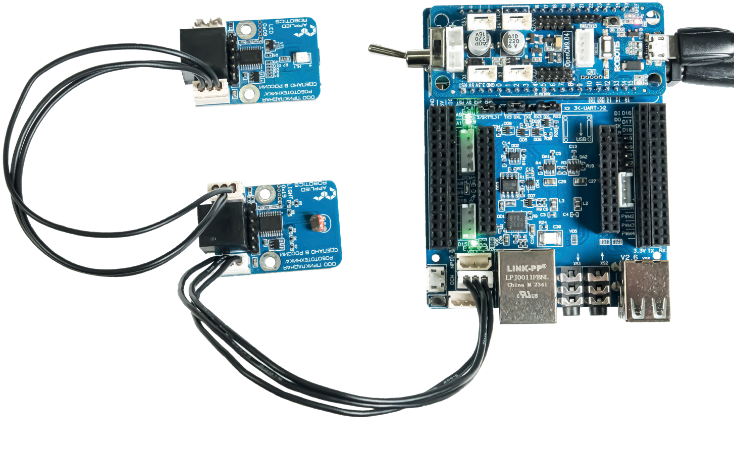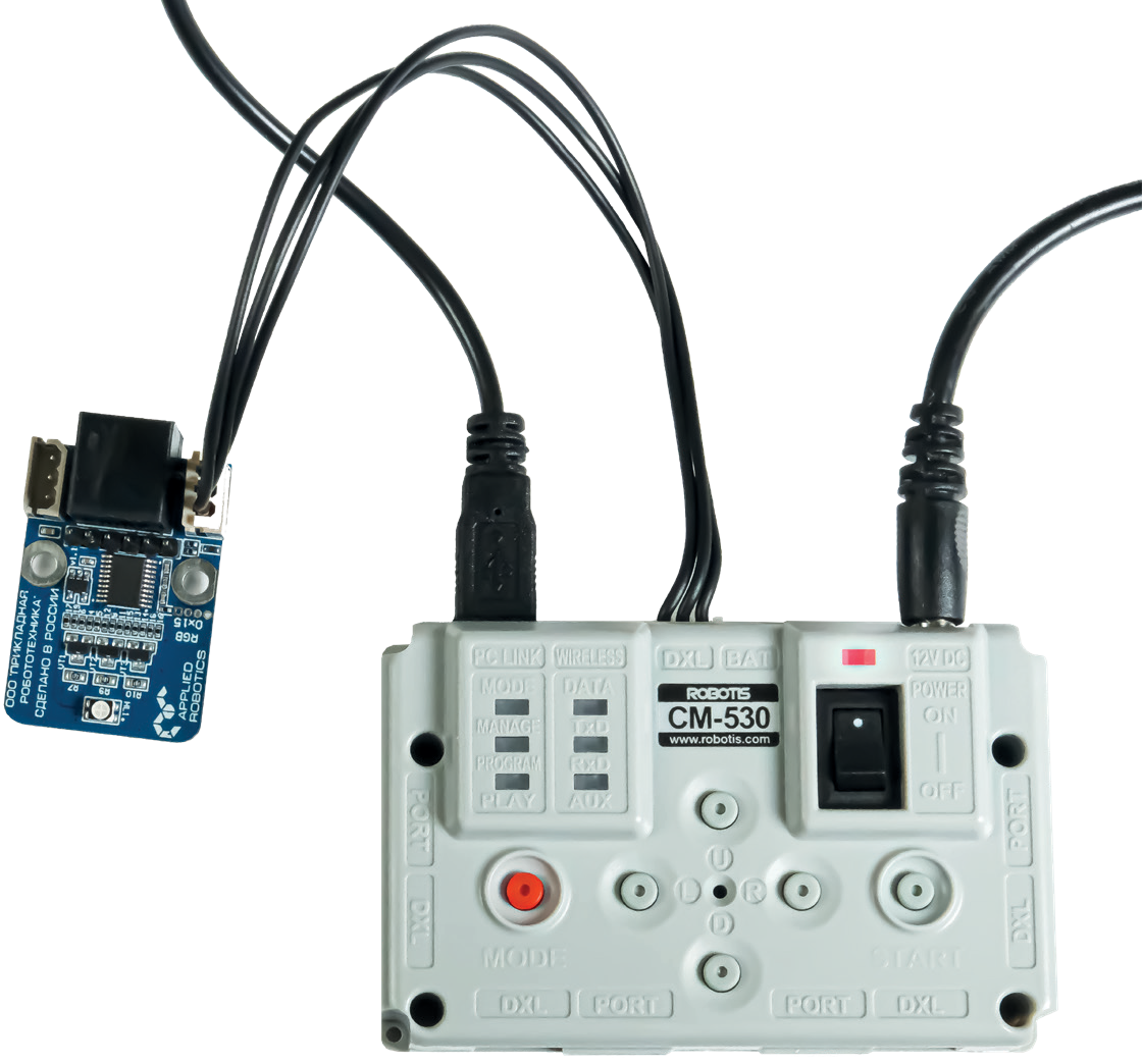 Другим глобальным подходом к работе с модулями является использование их в качестве Dynamixel-совместимых устройств. На каждом из модулей находится микроконтроллер, который реализует Dynamixel-интерфейс, тем самым, позволяя подключать различные модули последовательно друг за другом в цепь. Такой способ подключения имеет преимущество, если необходимо подключить одновременно много модулей к контроллеру и максимально снизить количество используемых в коде библиотек. Для работы с несколькими разнотипными модулями одновременно достаточно только одной библиотеки.
