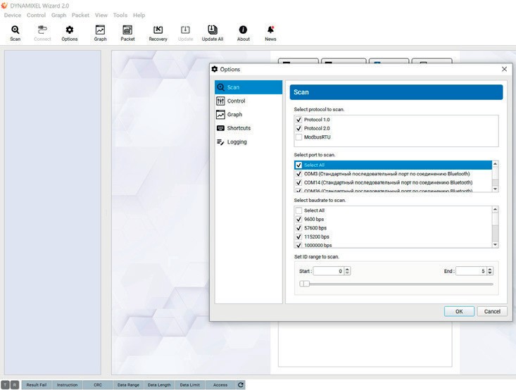 В открывшимся окне установите необходимый протокол для поиска устройств (2.0), выберите COM порт, к которому в данный момент подключен преобразователь интерфейса USB-DXL-AR, и установите скорость обмена данными (1000000). Нажмите кнопку ОК. (Рис 4.10).
