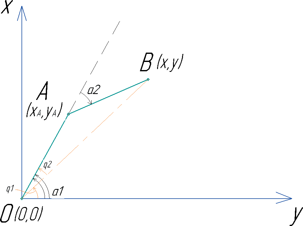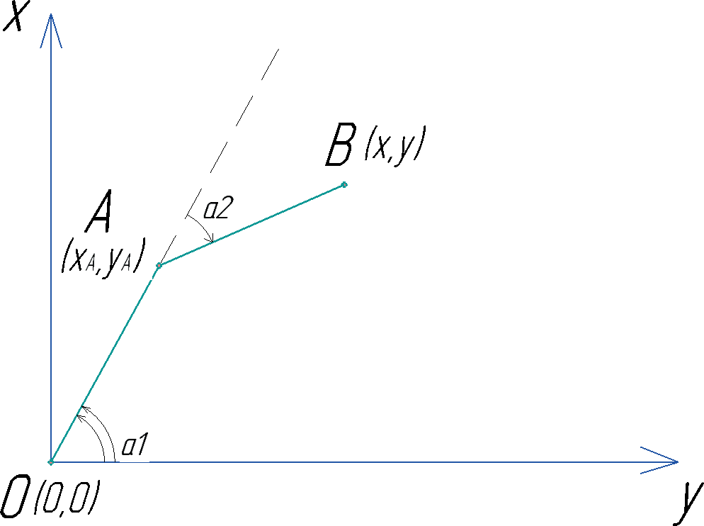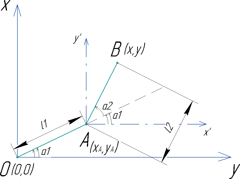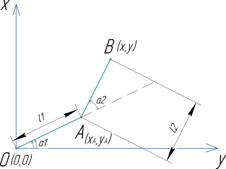 задачи (определения расположения рабочего органа манипулятора) при такой конфигурации манипулятора требуется найти координаты точки B (x, y).