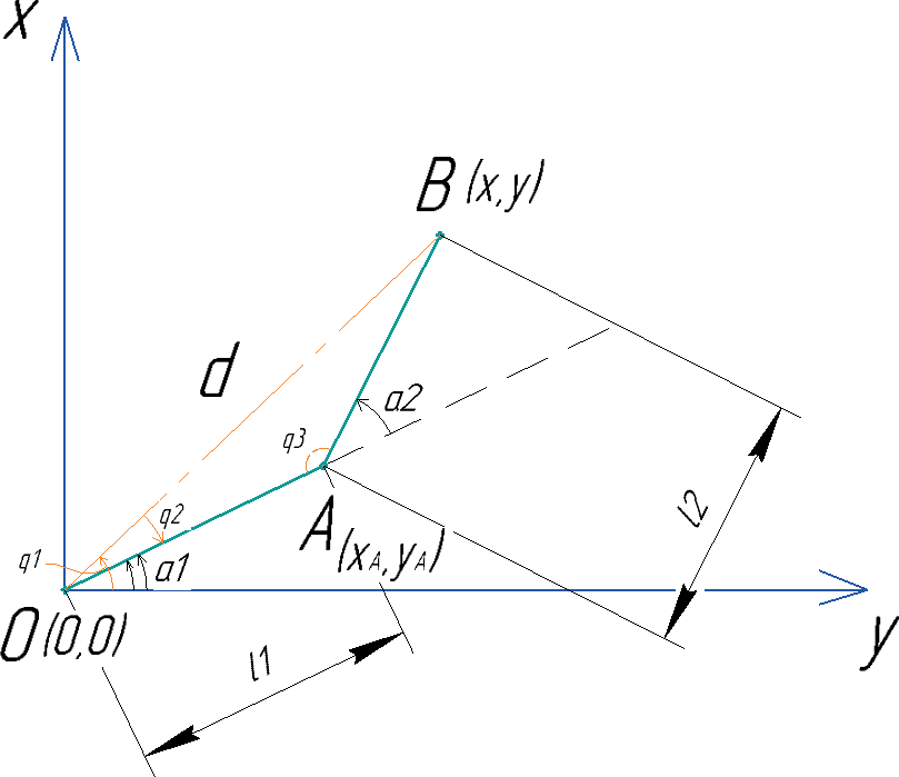 Рассмотрим решение ОЗК. Проведем дополнительный отрезок d, а также обозначим вспомогательные углы q1 (от оси x до d), q2(от d до OA) и q3(между OA и AB):