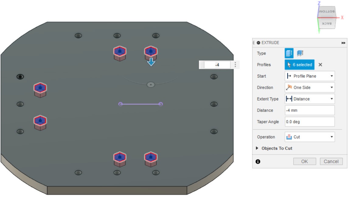 - Выдавливаем отверстия (Hole) (используем эскиз п.4).