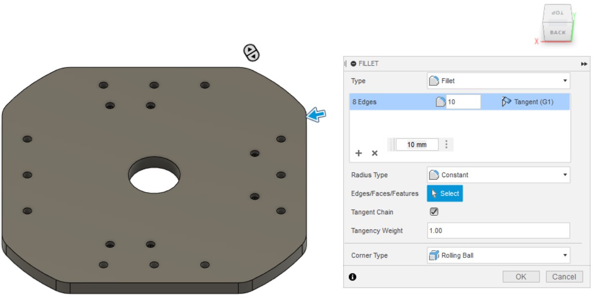 - Делаем скругление по периметру выдавленной части детали.